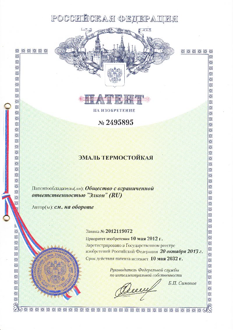 8 (812) 603-41-31Компания «ЭЛКОН» 28 октября 2013 г. получила очередной Патент Российской Федерации «Эмаль термостойкая». В разработке формулы изобретения участвовали: Катанаев А.И., Миргазитова Р.С., Поливанов А.Н., Рыжова О.Г., Конторов А.М. Совместная работа компании «ЭЛКОН» и ведущего института страны ГНИИХТЭОС увенчалась успехом, получен Патент «Эмаль термостойкая», созданная на базе метилфенилсилоксановой смолы на основе органоалкоксисиланов общей формулы:
